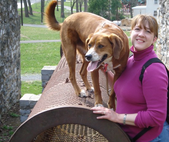Lipreading Mom’s Note: When I think of an inspiring role model for all of us lipreading moms and dads, I think of Denise Portis. This mom of two not only thrives with a profound hearing loss, but she lives with the balance-affective condition Meniere’s Disease. The first thing I noticed about Denise was her sense of childlike wonder. In many photos, Denise hangs out with a cute canine named Chloe, her lovable hearing service dog. On her blog, Hearing Elmo, the main image is of Denise snuggling with a dozen red Elmo dolls. After receiving a cochlear implant, Elmo’s vibrant, giggling voice was the first sound Denise heard. Denise shares how her hearing loss journey models creativity and compassion to her two children.