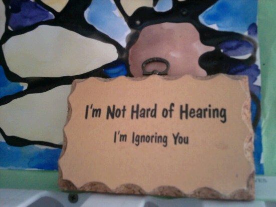 “I’m not hard of hearing. I’m ignoring you.” I love this sign that hangs at home. When it comes to rude comments, I’m finding it can be a good thing to pretend I didn’t hear. Or I can turn off my ears by taking out my hearing aids.