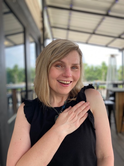 Photo description: Lipreading Mom places her hand over her heart and smiles.