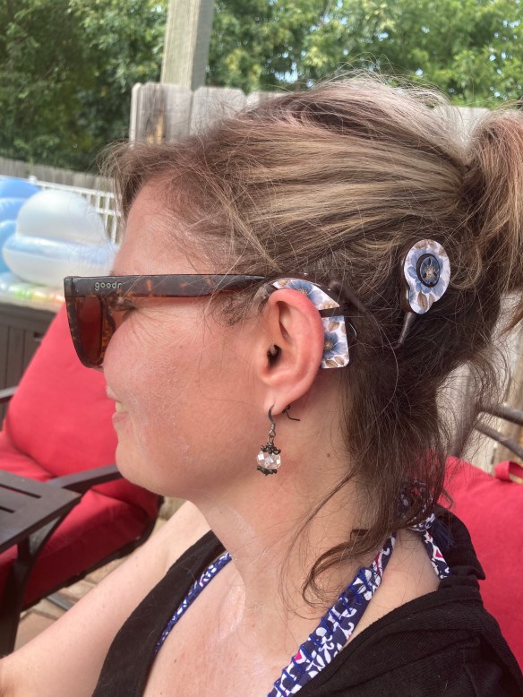 (Photo description: I sit outside near a pool with my hair pulled into a ponytail. My decorated cochlear implant is visible behind my left ear.)
