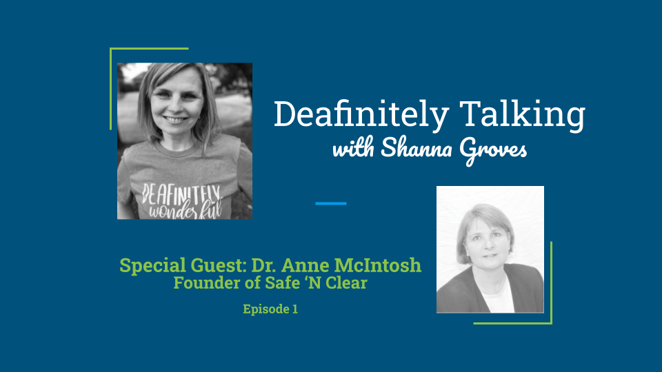 Black and white photos of Shanna Groves and Dr. Anne McIntosh are featured on a teal background with the words “Deafinitely Talking with Shanna Groves, Special Guest Dr. Anne McIntosh, Founder of Safe “N’ Clear, Episode 1.”