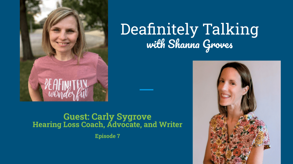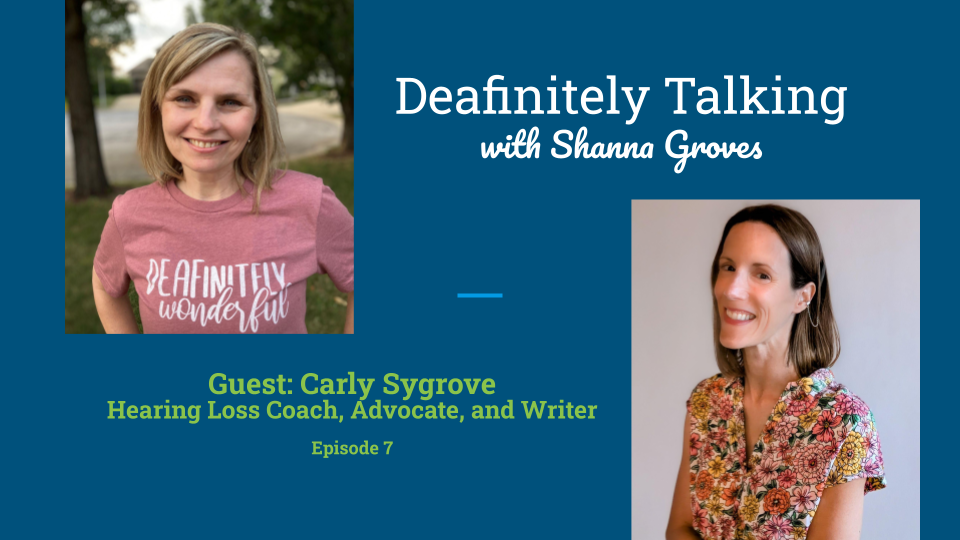 On a teal background are two photos of women and the text Deafinitely Talking with Shanna Groves. Guest Carly Sygrove, hearing loss coach, advocate, and writer. Episode 7. The first photo is of Shanna Groves, who wears a pink shirt with the words Deafinitely Wonderful. The second photo is of Carly Sygrove, who wears a floral shirt. Both women smile.