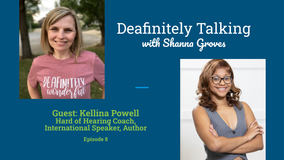 On a teal banner are photos of two women with the words Deafinitely Talking with Shanna Groves. Guest Kellina Powell, Hard of Hearing Coach, International Speaker, Author, Episode 8. The woman in the first photo wears a pink shirt with the words DEAFINITELY Wonderful. The woman in the second photo wears glasses, a gray v-neck shirt and has her arms crossed.
