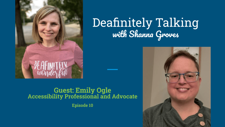 On a teal blue background are the words Deafinitely Talking with Shanna Groves. Guest Emily Ogle, Accessibility Professional and Advocate, Episode 10. There are two photos. In the first photo, Shanna Groves wears a pink shirt with the words Deafinitely Wonderful. The second photo is of Emily Ogle, who wears glasses and a green shirt with brown buttons.