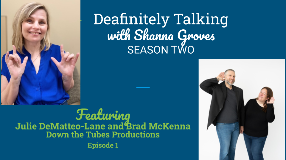 On a teal blue banner are the words Deafinitely Talking with Shanna Groves, Season Two. Featuring Julie DeMatteo-Lane and Brad McKenna, Down the Tubes Productions, Episode 1. In the upper left is a photo of Shanna Groves, who wears a royal blue shirt, is expressing the American Sign Language sign for “I love you”, and is flashing a smile. In the lower right is a photo of Brad McKenna and Julie DeMatteo-Lane, who stand with their hands cupping their ears in a gesture of listening. Both are wearing black shirts and blue jeans and are smiling.