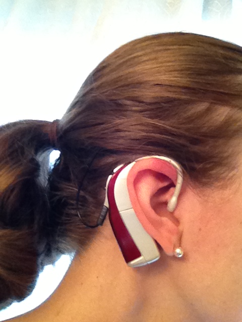Sveta’s burgundy hearing aids complement a Christmas wardrobe.
