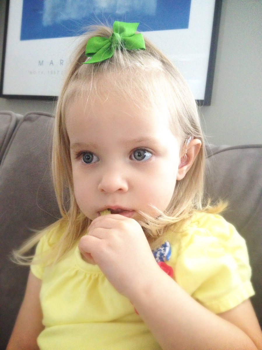Three-year-old Madeleine was diagnosed with bilateral sensorineural moderate-to-severe hearing loss and has worn hearing aids since the age of six months. Here she is enjoying a snack and her favorite TV show “Art & Paint.” She is featured on the Show Me Your Ears page.